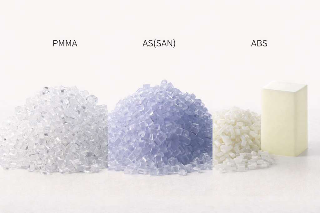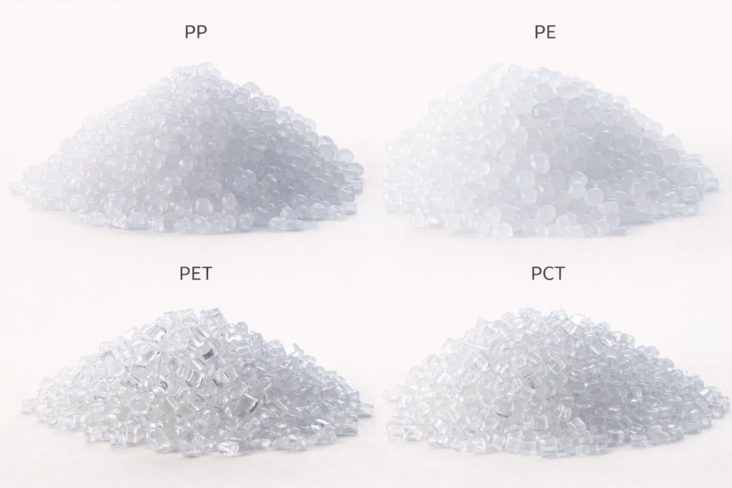 原料色は材質ごとに異なり、PPやPEはやや白みがかった外観、ASやPETやPMMAは透明感のある見た目が特徴です。ABSは乳白色と黄色の間のため透明には不向きです。